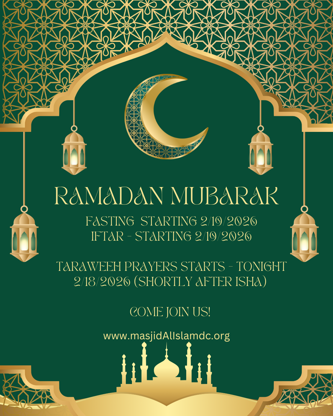 Ramadhan Mubarak – Masjid Al Islam DC will be hosting Iftar and performing Taraweeh prayer nightly during this glorious month, so please join us, InshaAllah.