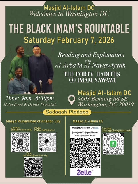 The Black Imams Roundtable gathered faith leaders and community members for a reflective reading and discussion of Al-Arba’in Al-Nawawiyyah, the Forty Hadith of Imam Nawawi. The event created space for shared learning, spiritual reflection, and dialogue centered on prophetic teachings, ethical conduct, and community leadership.